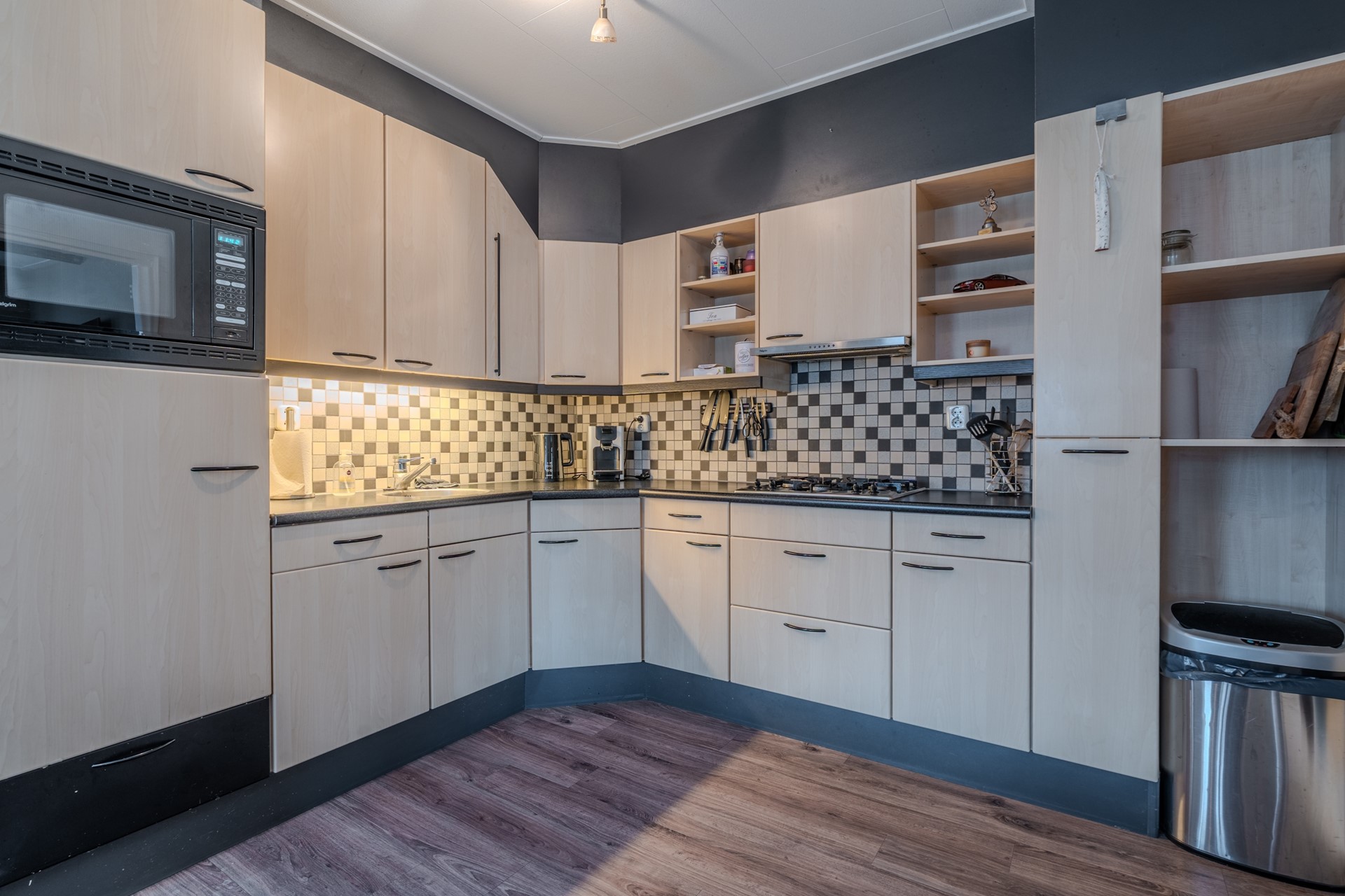 De gesloten keuken met eethoek is volledig ingericht en voorzien van diverse apparatuur, waaronder een 4-pits gaskookplaat, afzuigkap, koelkast, magnetron en een (losse) vaatwasser, waardoor koken en tafelen zowel praktisch als gezellig is.