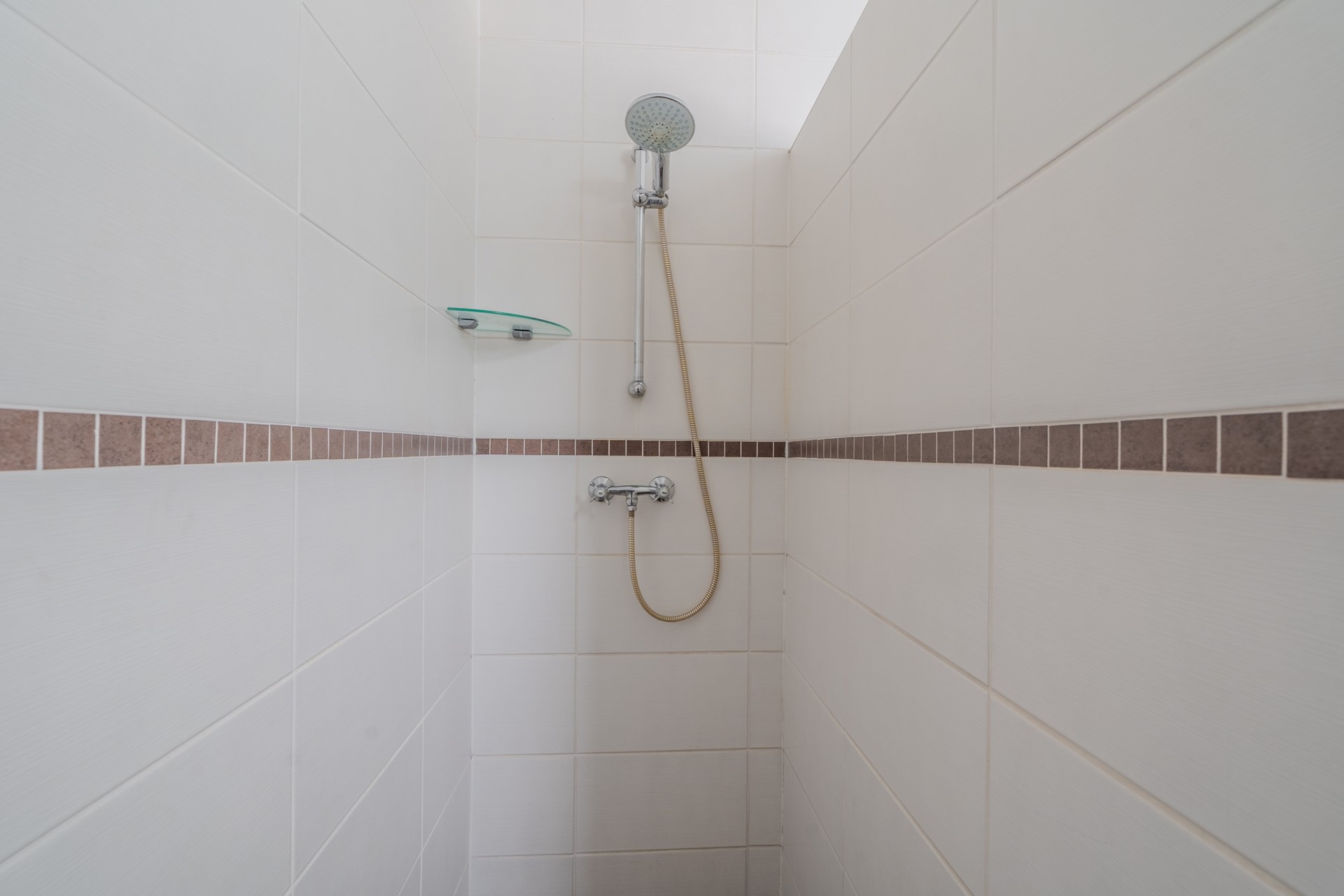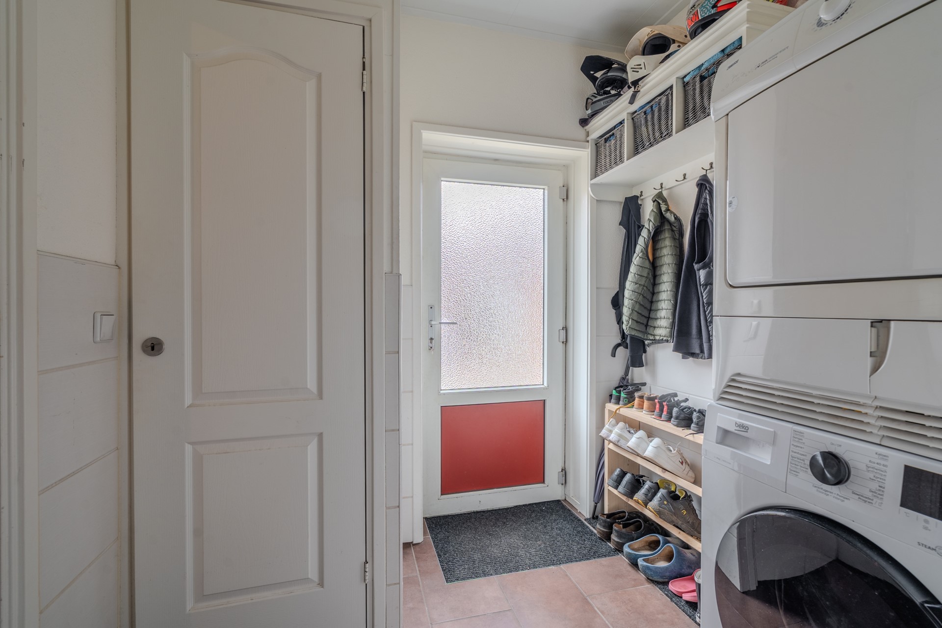 Aangrenzend bevindt zich de bijkeuken, voorzien van witgoedaansluitingen en de cv-opstelling. Vanuit de bijkeuken is de nette badkamer bereikbaar, uitgerust met een toilet, wastafel met meubel en een inloopdouche, waardoor functionaliteit en comfort optimaal gecombineerd worden.