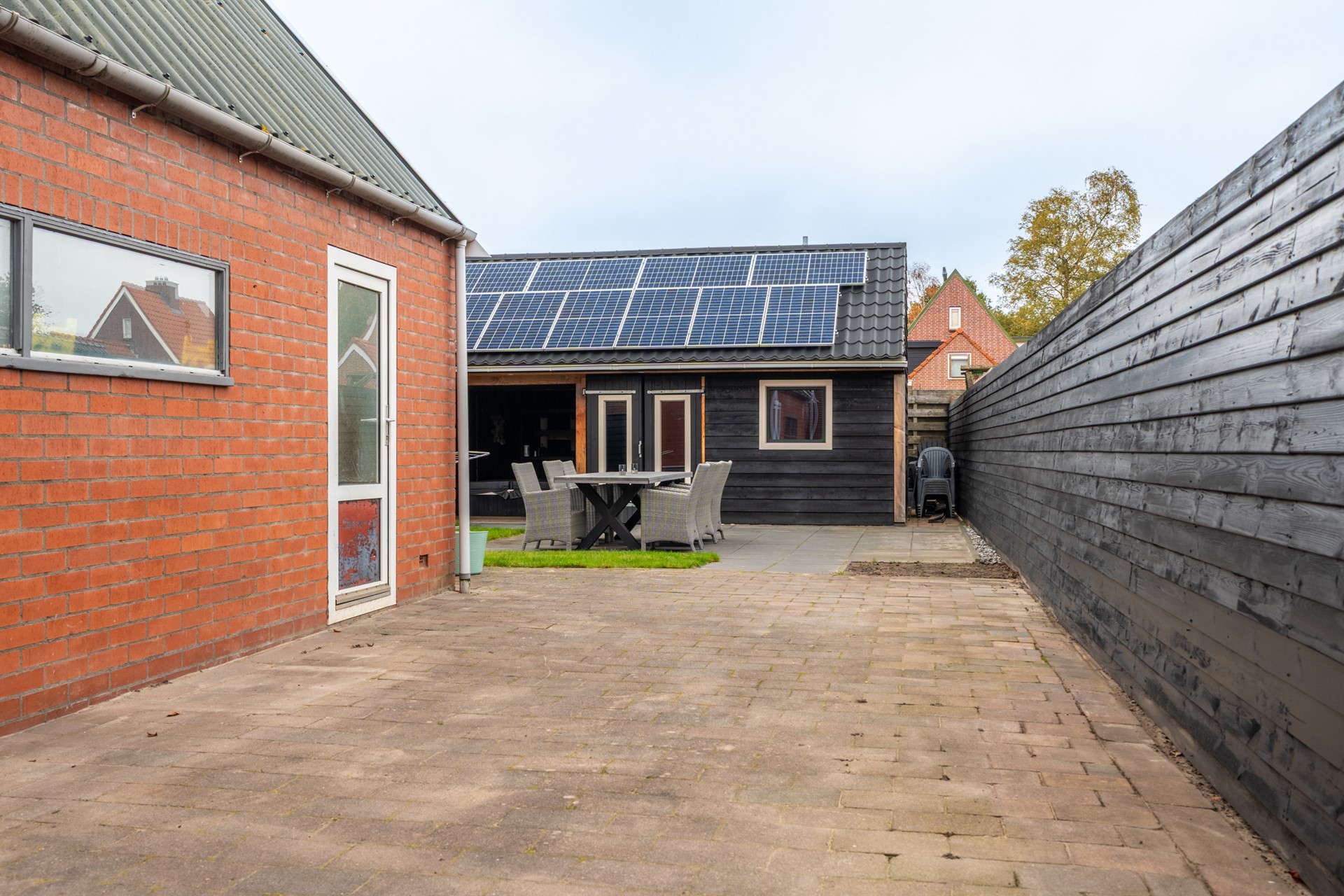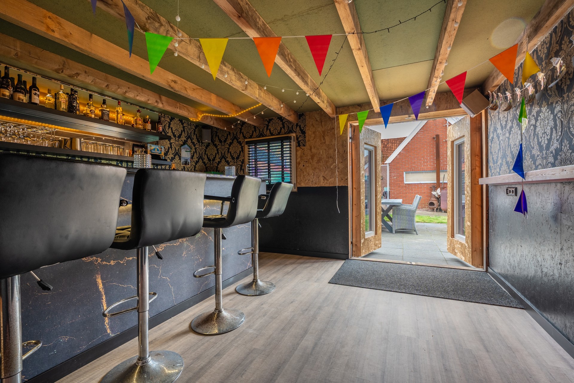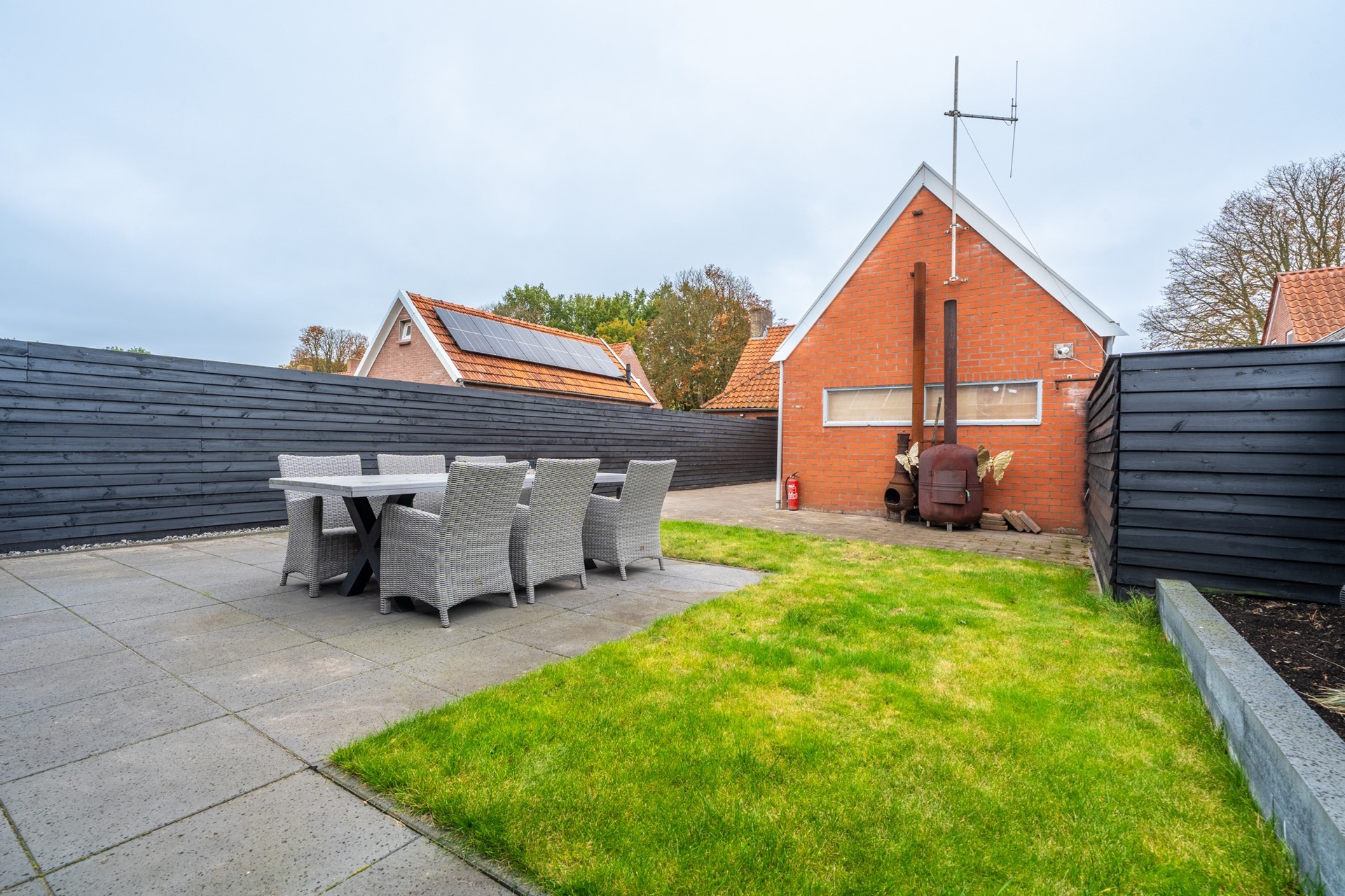 De besloten achtertuin op het noorden is sfeervol aangelegd met meerdere terrassen, een gazon en een vrijstaande houten berging (momenteel in gebruik als mancave) met overkapping. Zo kunt u optimaal genieten van zon, privacy en buitenleven.
