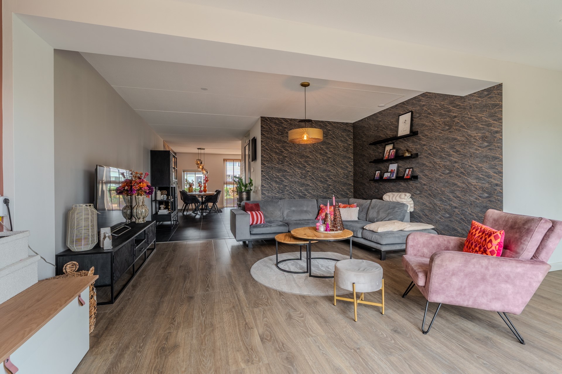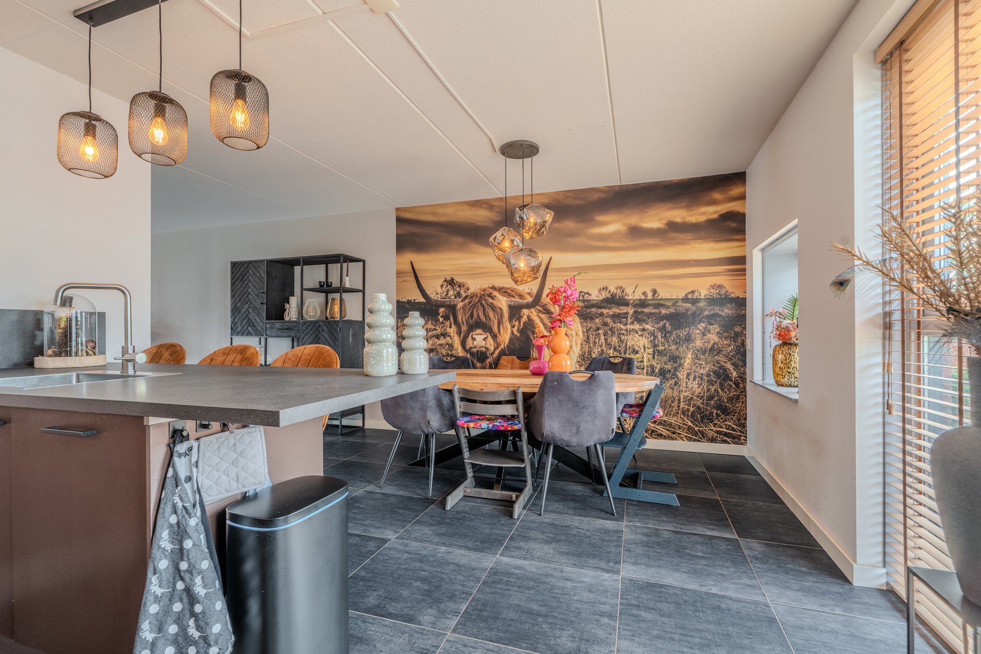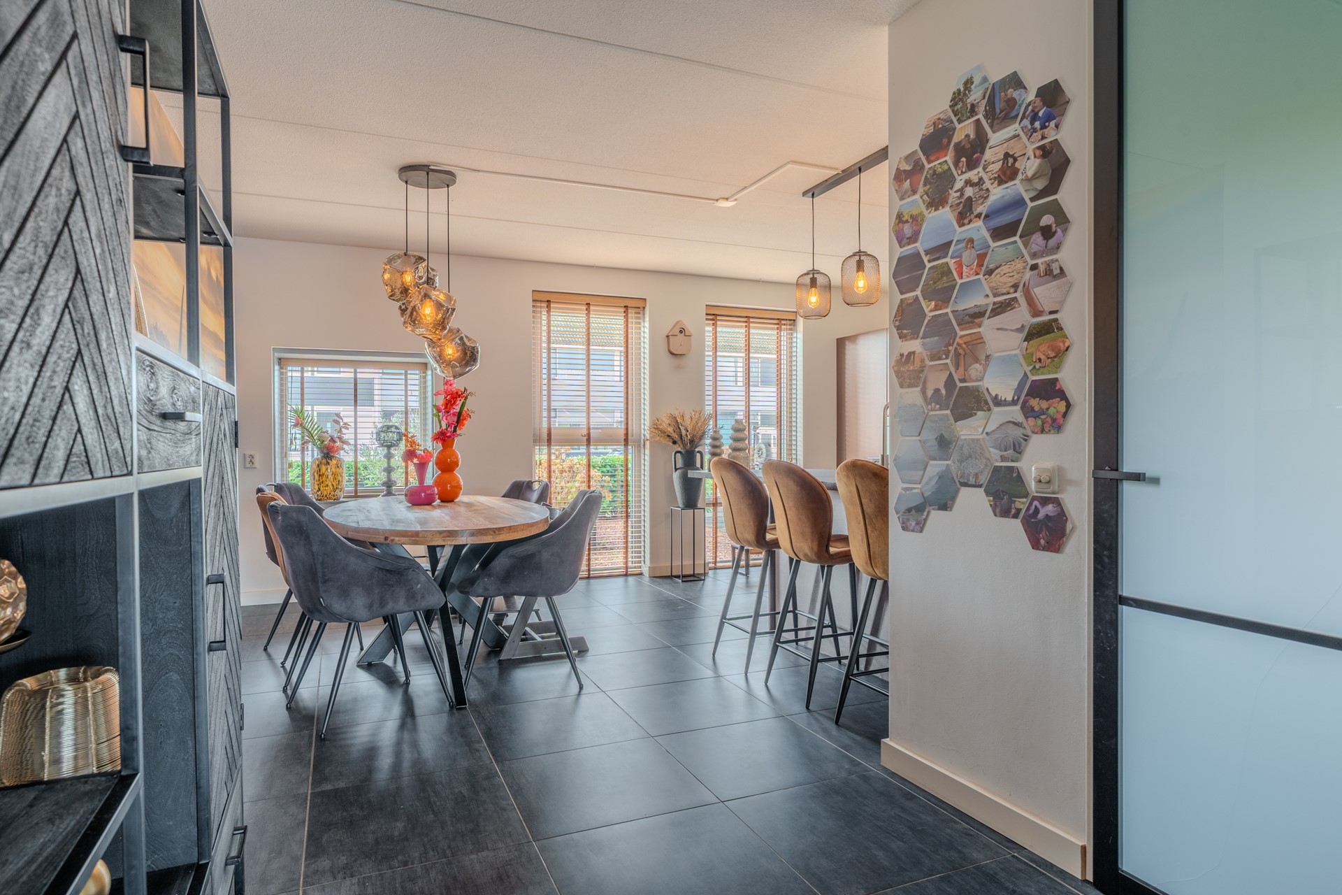 De lichte woonkamer staat in open verbinding met de keuken en biedt via een schuifpui toegang tot de achtertuin. De moderne keuken is uitgerust met diverse inbouwapparatuur, waaronder een inductiekookplaat, afzuigkap, koel-vriescombinatie, vaatwasser en combi-magnetron.