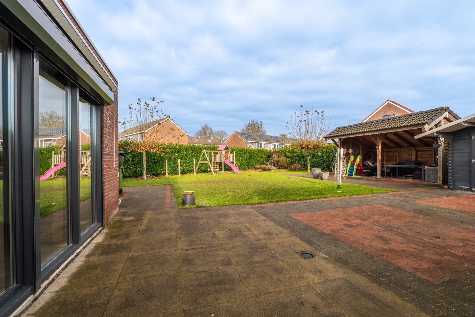 De aangebouwde stenen garage van circa 18,5 m² biedt volop ruimte voor het stallen van een auto en fietsen, evenals voor het opbergen van tuingereedschap. De besloten achtertuin, gelegen op het oosten, is voorzien van een gazon, diverse terrassen, een vrijstaand houten tuinhuis en een overkapping.