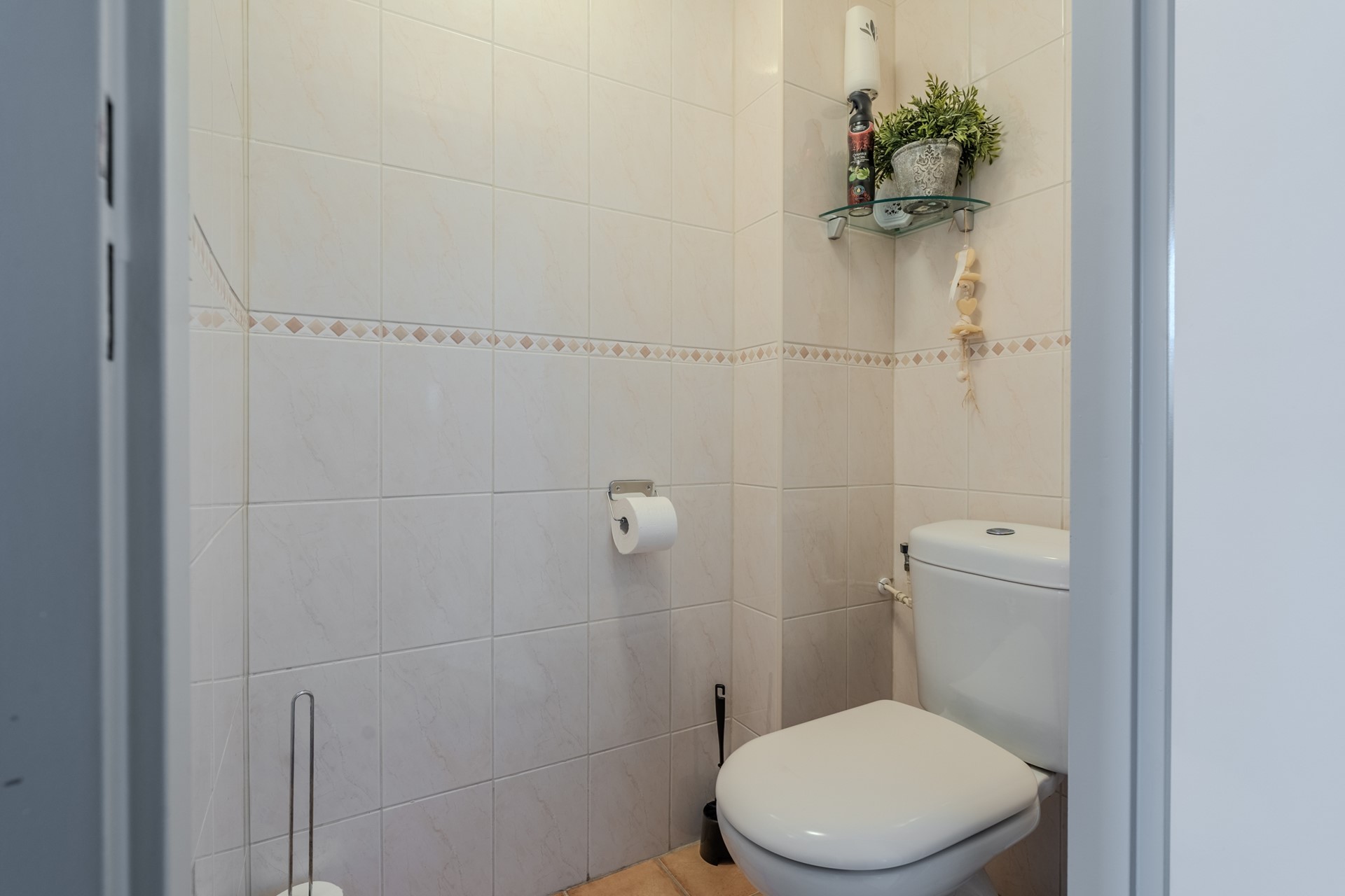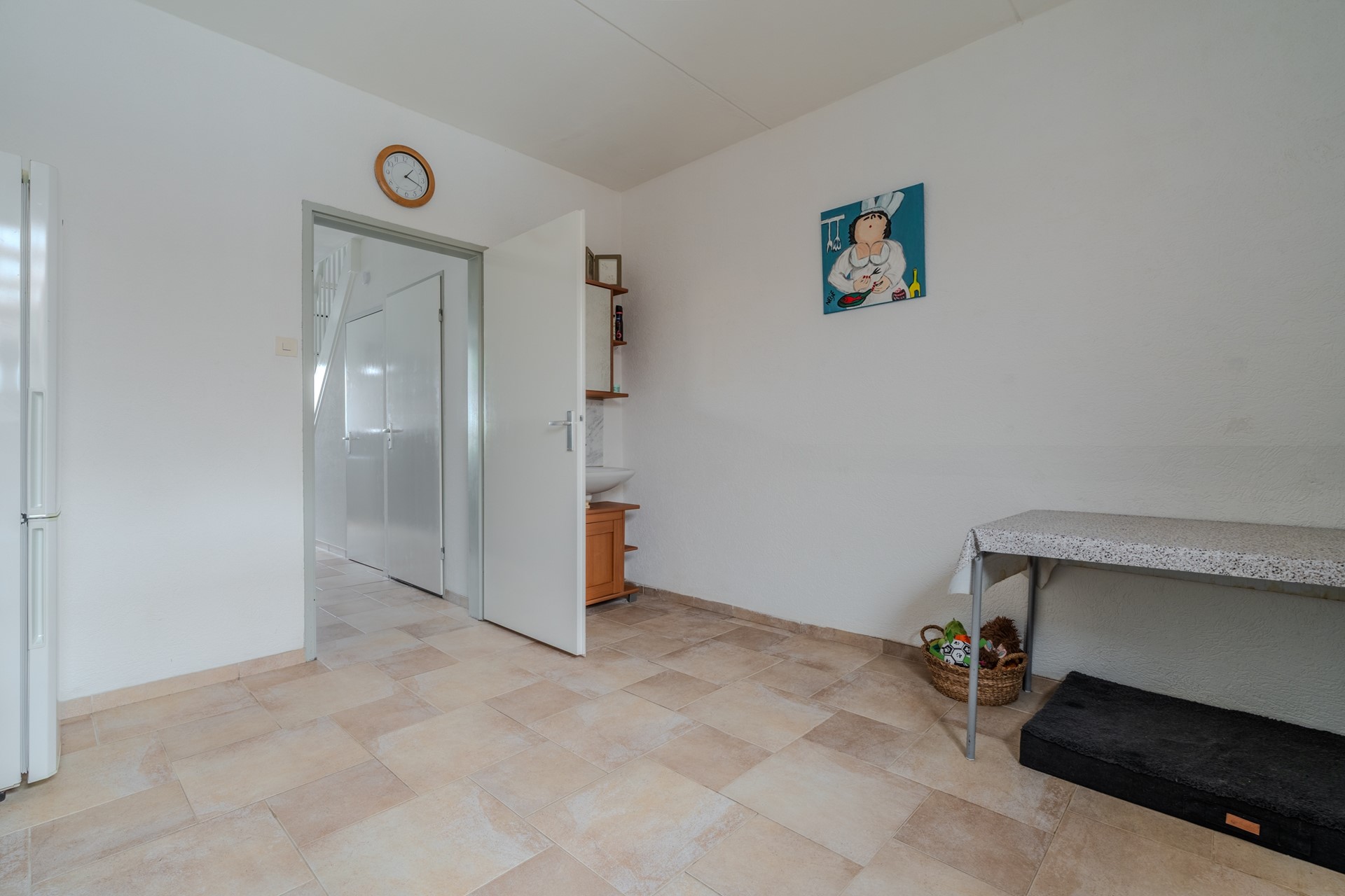 Via de voordeur komt u binnen in de hal met toegang tot het toilet, een praktische kantoor-/slaapkamer en de lichte woonkamer. De woonkamer is voorzien van airconditioning en staat in halfopen verbinding met de landelijke keuken, uitgerust met een 5-pits gaskookplaat, oven, afzuigkap en vaatwasser. Aansluitend vindt u de bijkeuken met witgoedaansluitingen en toegang tot de achtertuin.