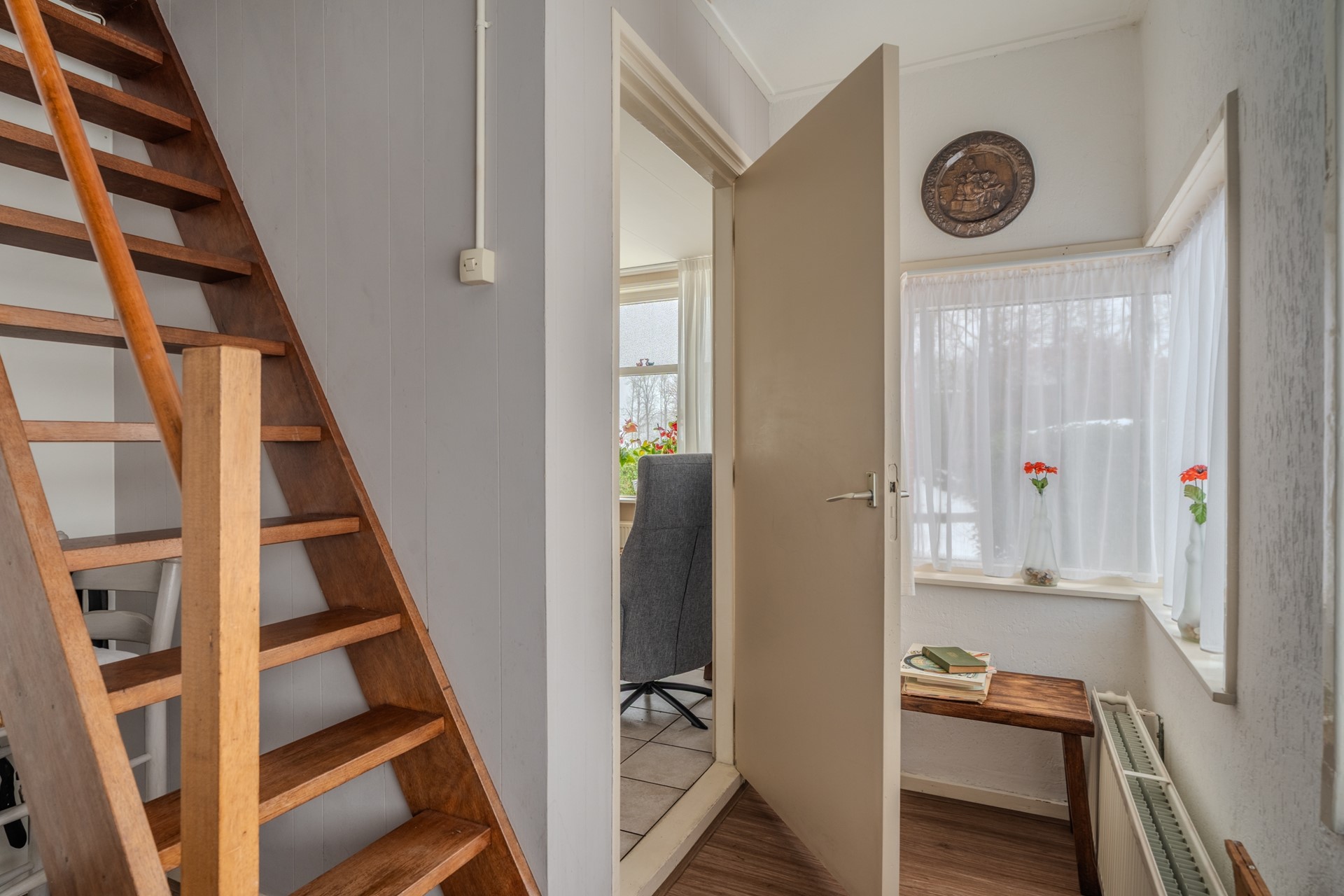 Via de voordeur betreedt u de entree/hal met meterkast. Vanuit de hal heeft u toegang tot de ruime Z-vormige woonkamer, die is voorzien van een pelletkachel. Vanuit de woonkamer bereikt u een slaapkamer van circa 10,2 m² met trapopgang naar de verdieping, de kelder en de gesloten keuken.