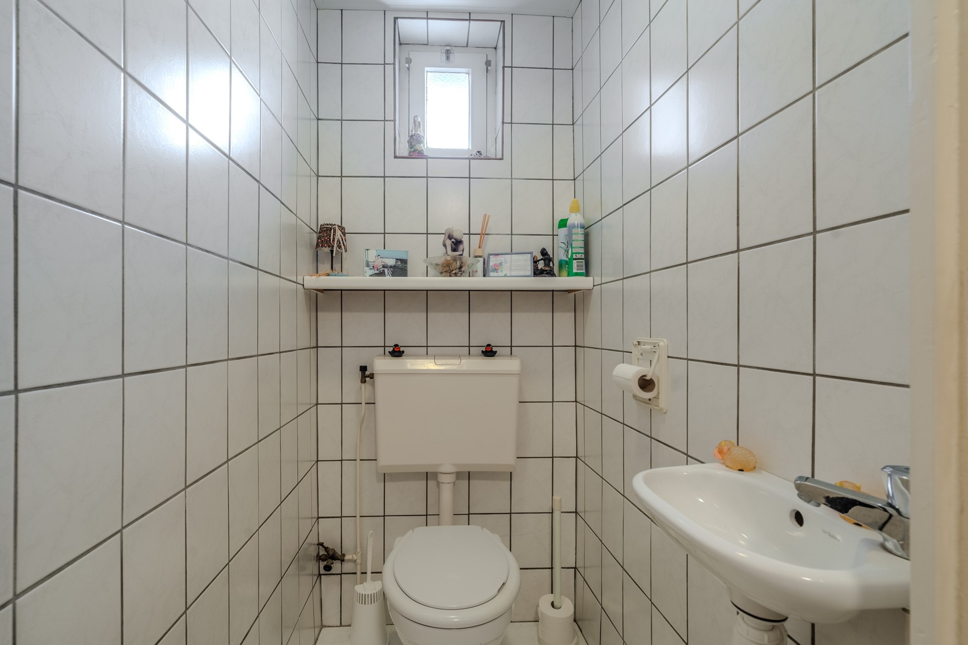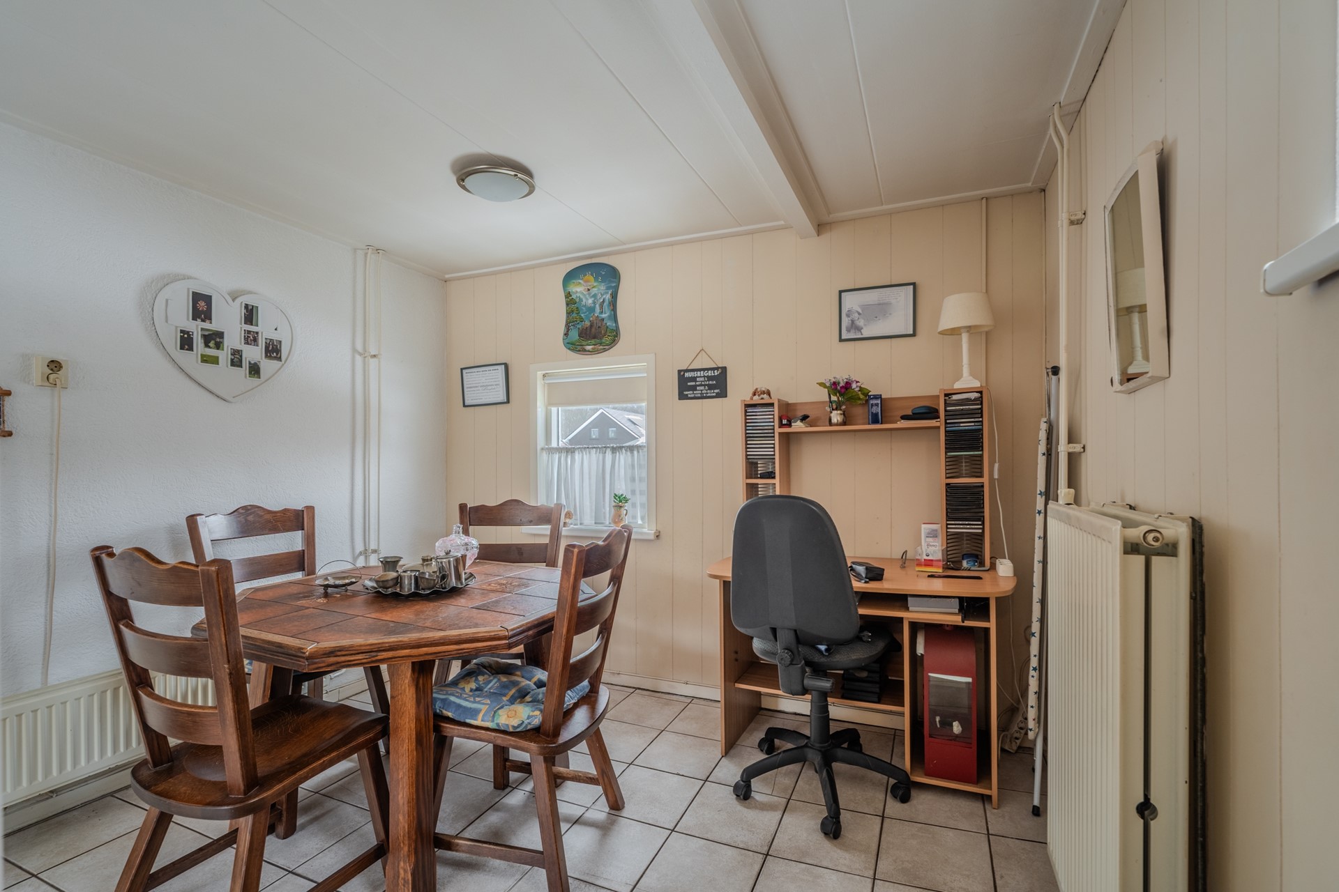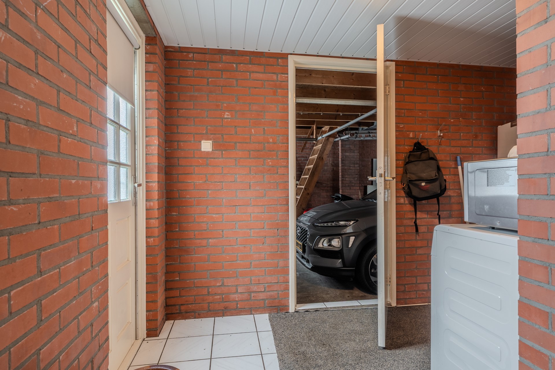 De keuken is uitgerust met onder andere een 4-pits gasfornuis, afzuigkap, oven, koelkast en een aansluiting voor de wasmachine. Aangrenzend bevindt zich een hal met toiletruimte, badkamer en toegang tot zowel de aangebouwde garage als de achtertuin. De badkamer is voorzien van een inloopdouche, wastafel en radiator.