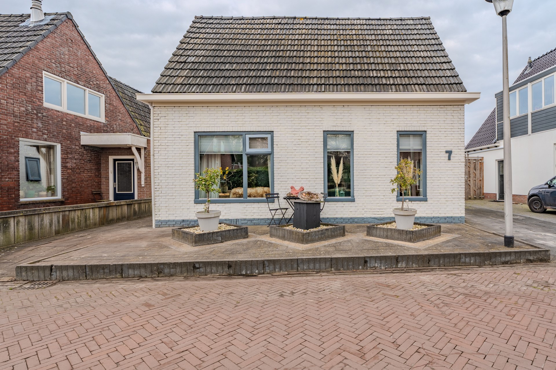 De voortuin is onderhoudsvriendelijk aangelegd als siertuin. Langs de woning bevindt zich een ruime oprit met parkeergelegenheid voor meerdere auto’s op eigen terrein.
