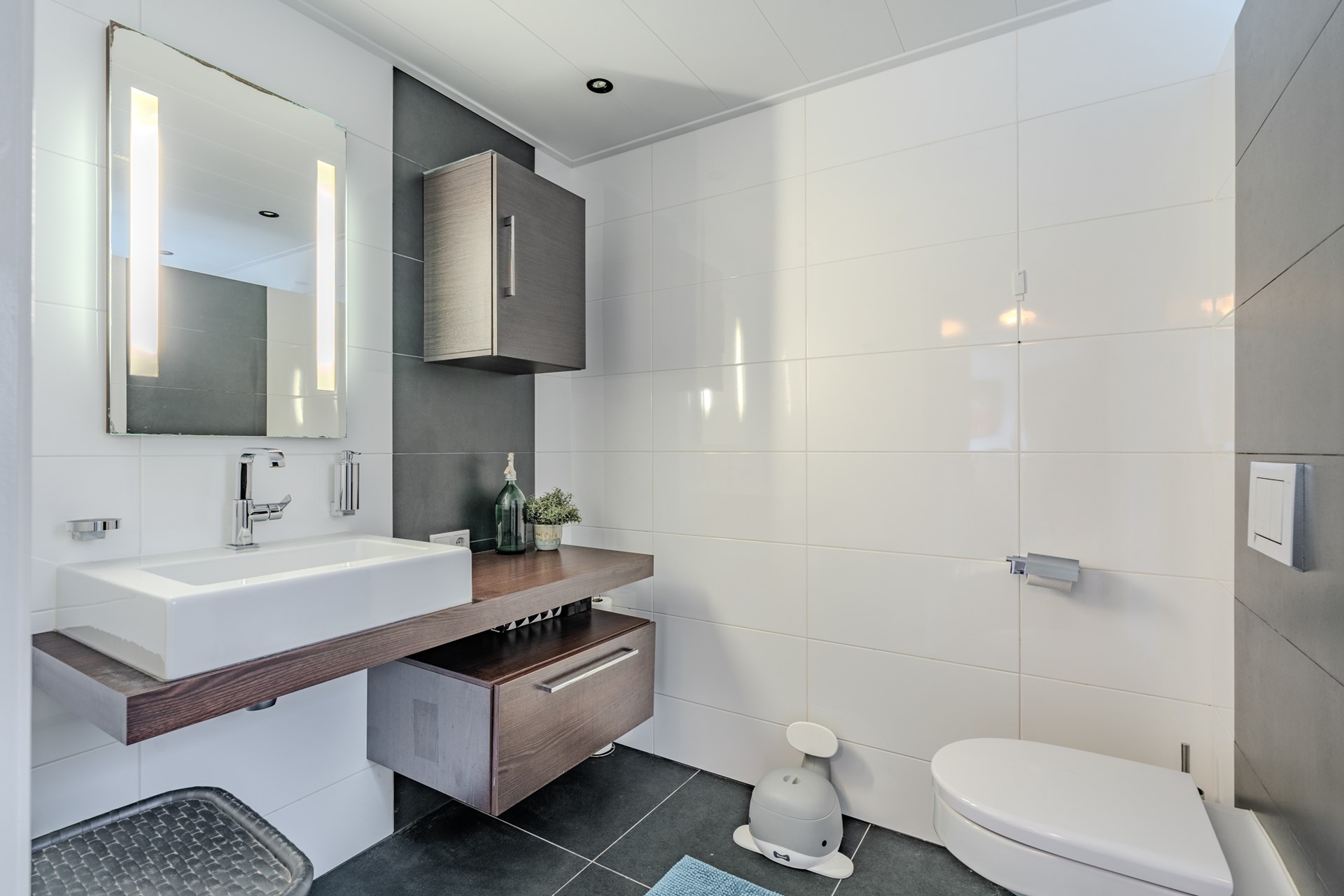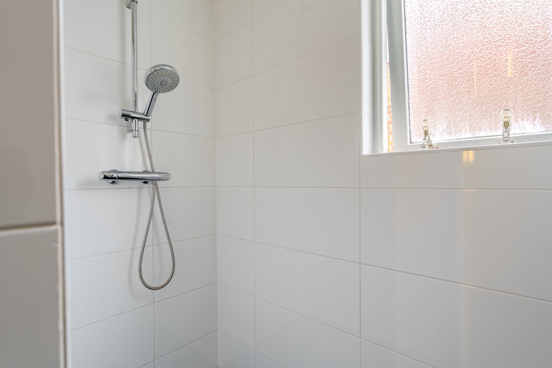 Vanuit de centrale hal heeft u toegang tot de badkamer, cv-ruimte, wasruimte en de slaapkamer op de begane grond van circa 15,7 m². De nette badkamer is voorzien van een inloopdouche, wastafel met meubel en een wandcloset. De slaapkamer aan de achterzijde beschikt over openslaande tuindeuren naar de tuin.