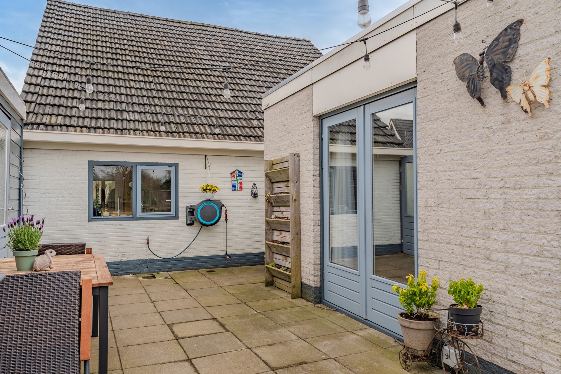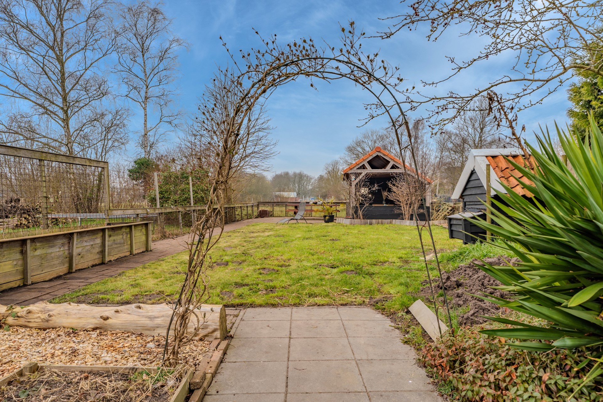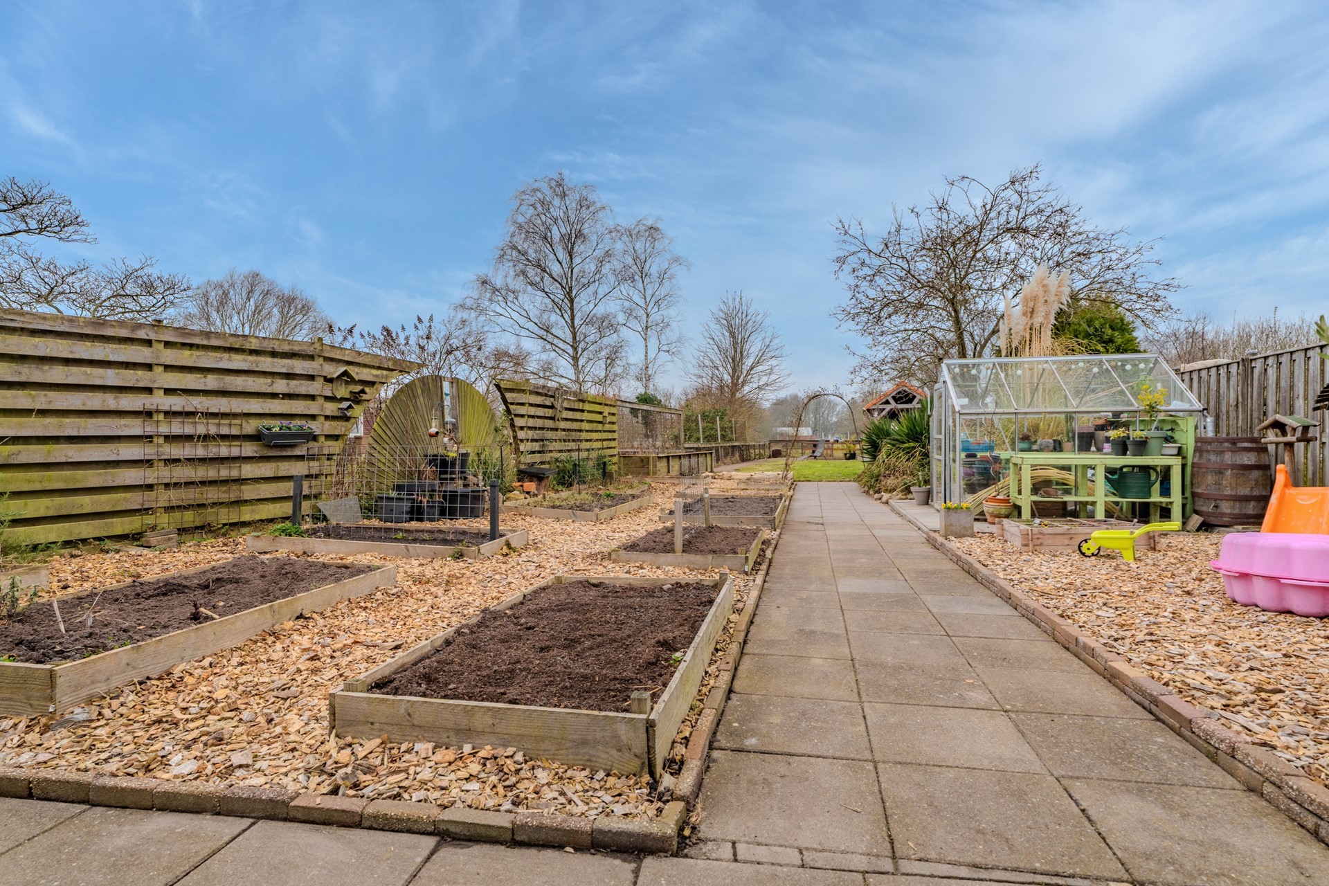 De verzorgde, ruime en onderhoudsvriendelijke achtertuin biedt volop mogelijkheden om van het buitenleven te genieten en beschikt over meerdere terrassen, een gazon, een moestuin en een plantenkas. De moestuin is ideaal voor het telen van eigen groenten, bloemen, kruiden of fruit. Daarnaast is er een fraaie vrijstaande houten berging van ca. 8,4 m² met overkapping.