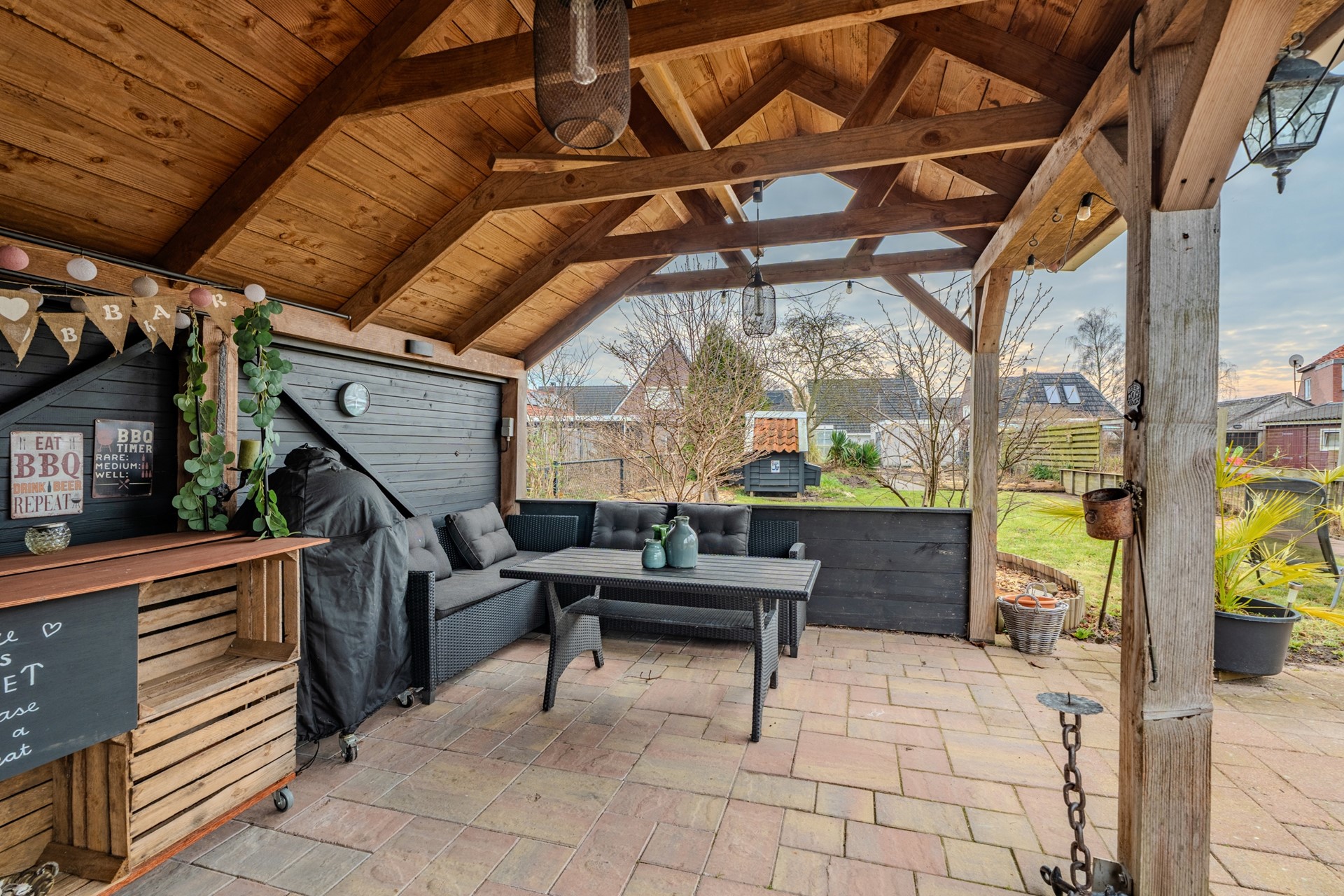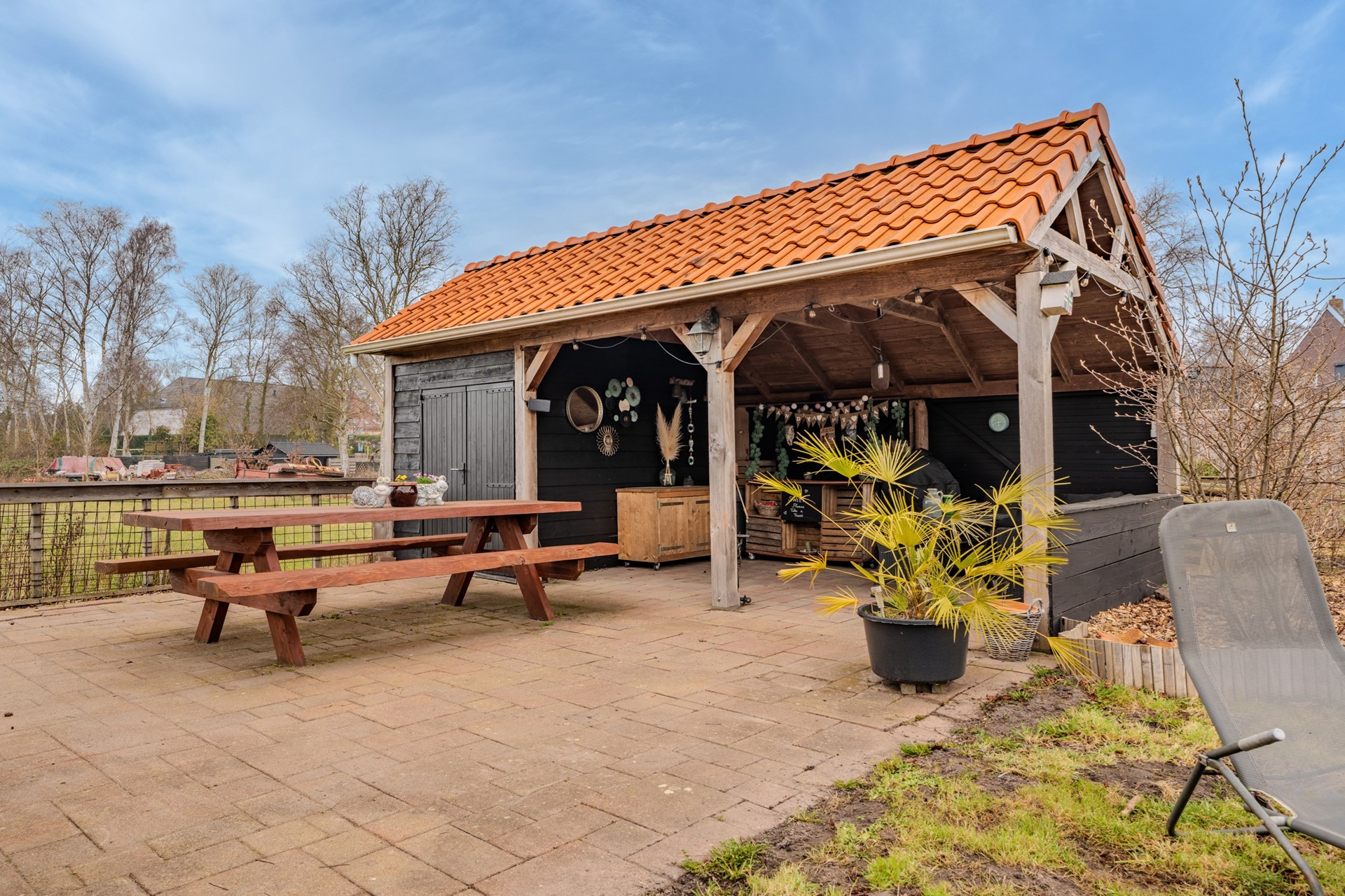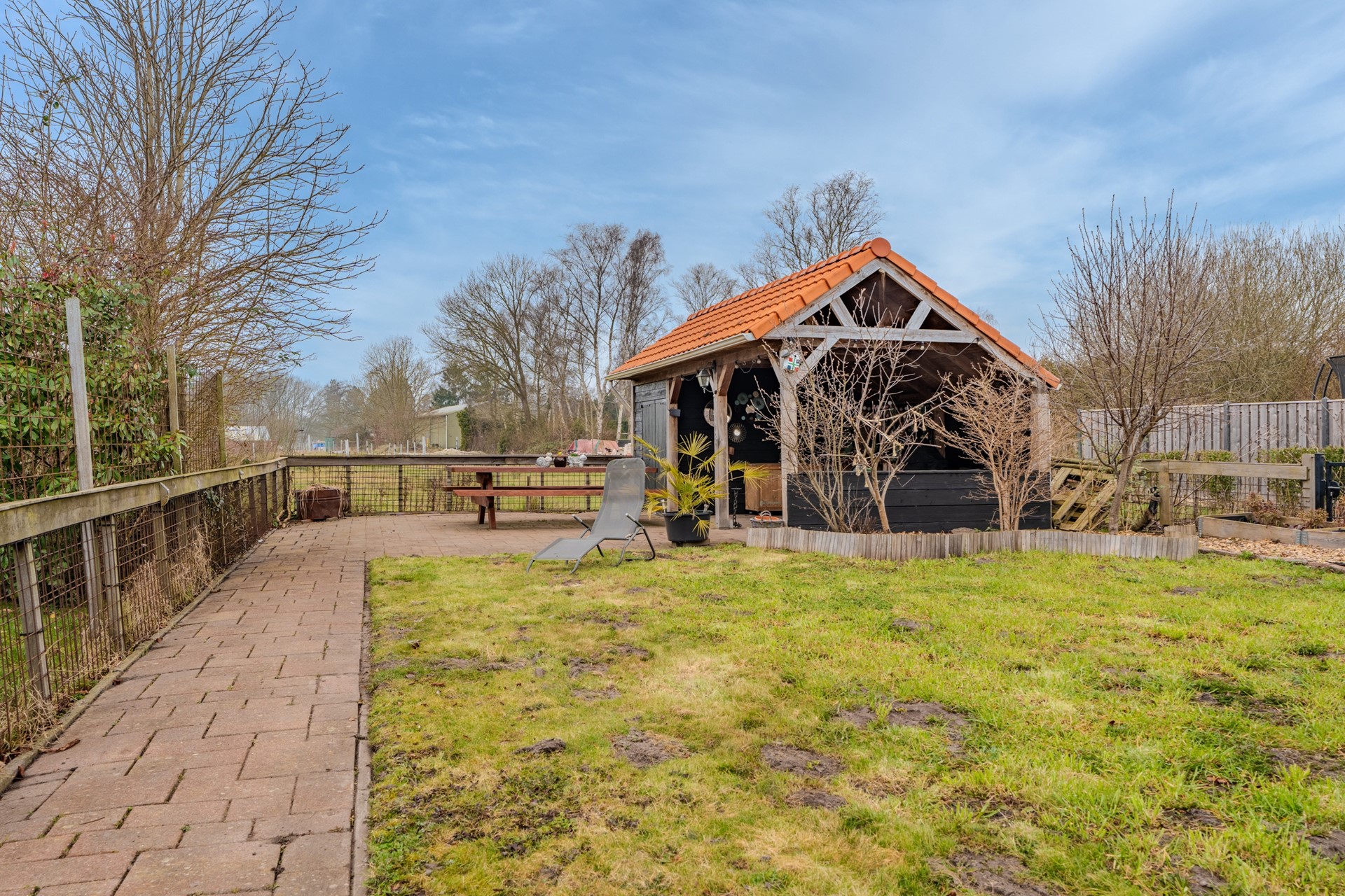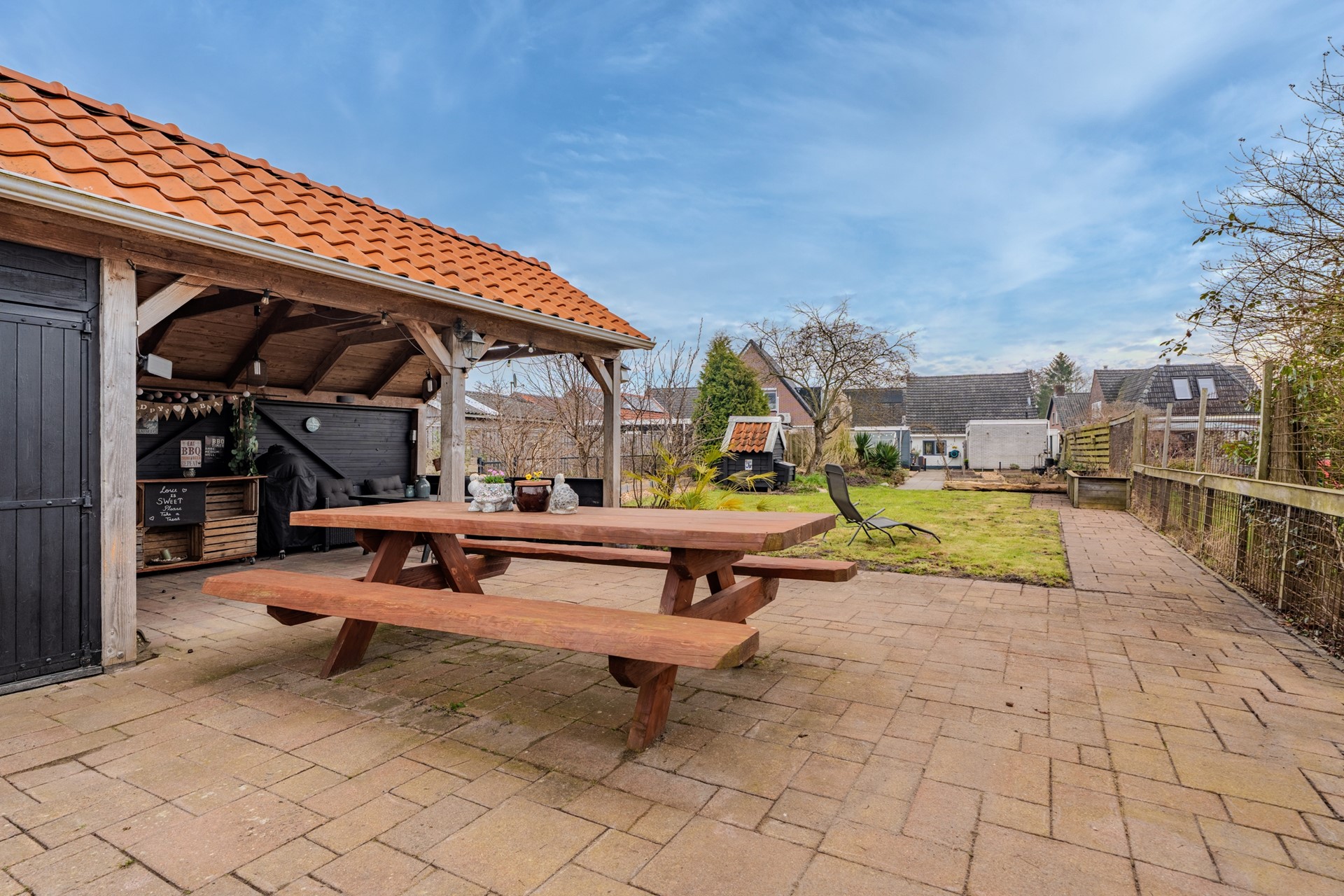 * Eigen oprit, overkapping en een vrijstaande houten garage;