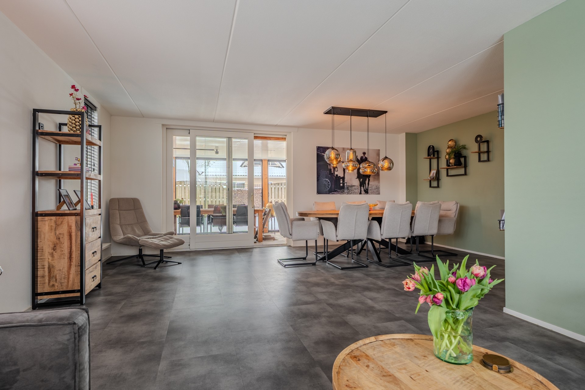 De sfeervolle woonkamer beschikt over een ruime eethoek en een schuifpui die toegang biedt tot de overkapping. De moderne keuken is uitgerust met onder andere een 5-pits inductiekookplaat, afzuigkap, koelkast, combi-oven en vaatwasser.