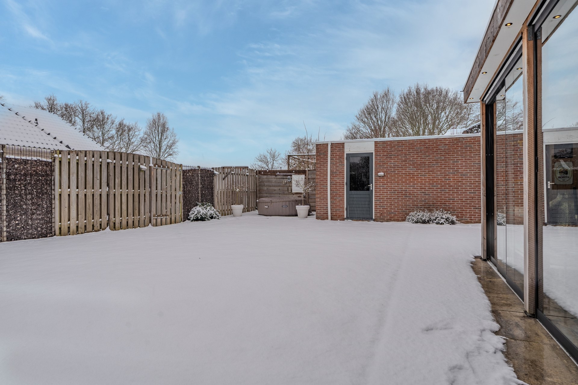 De besloten achtertuin, gelegen op het westen, is verzorgd aangelegd met een gazon, diverse terrassen, een eigen achterom en een sfeervolle overkapping met elektra en glaswanden.