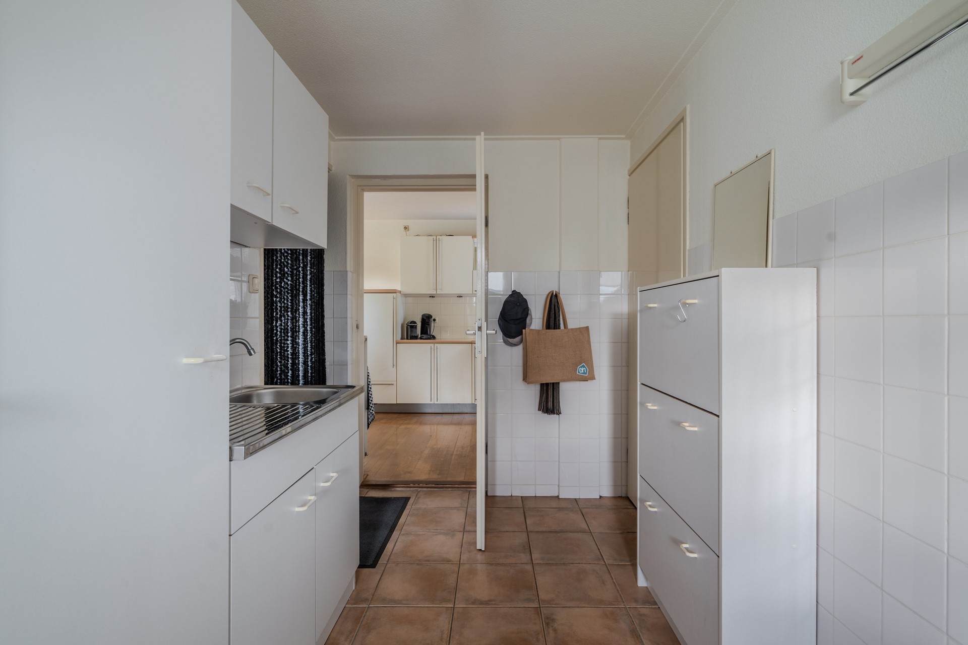 Aansluitend bevindt zich de bijkeuken met witgoedaansluitingen, de cv-opstelling en toegang tot zowel de garage als de achtertuin.