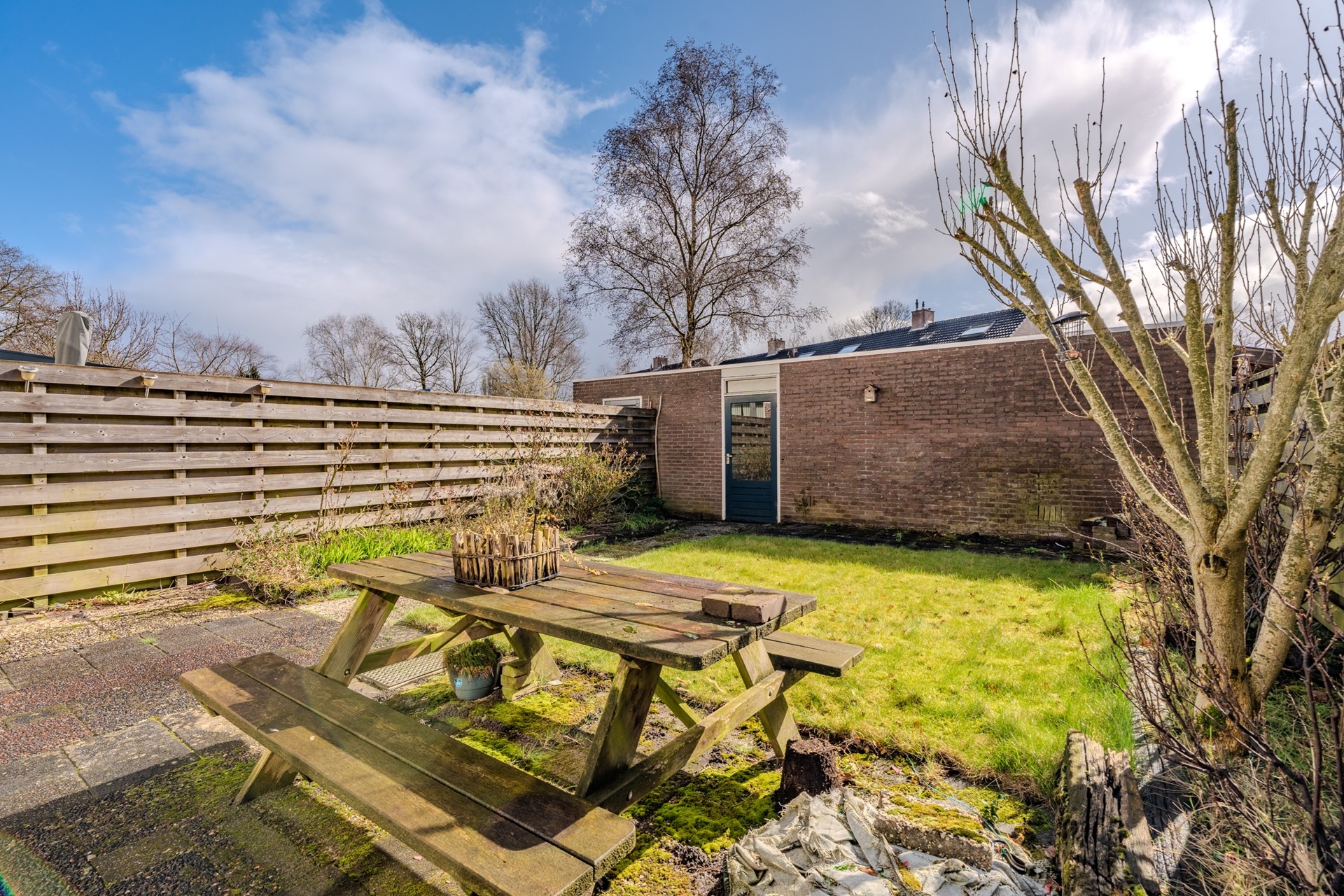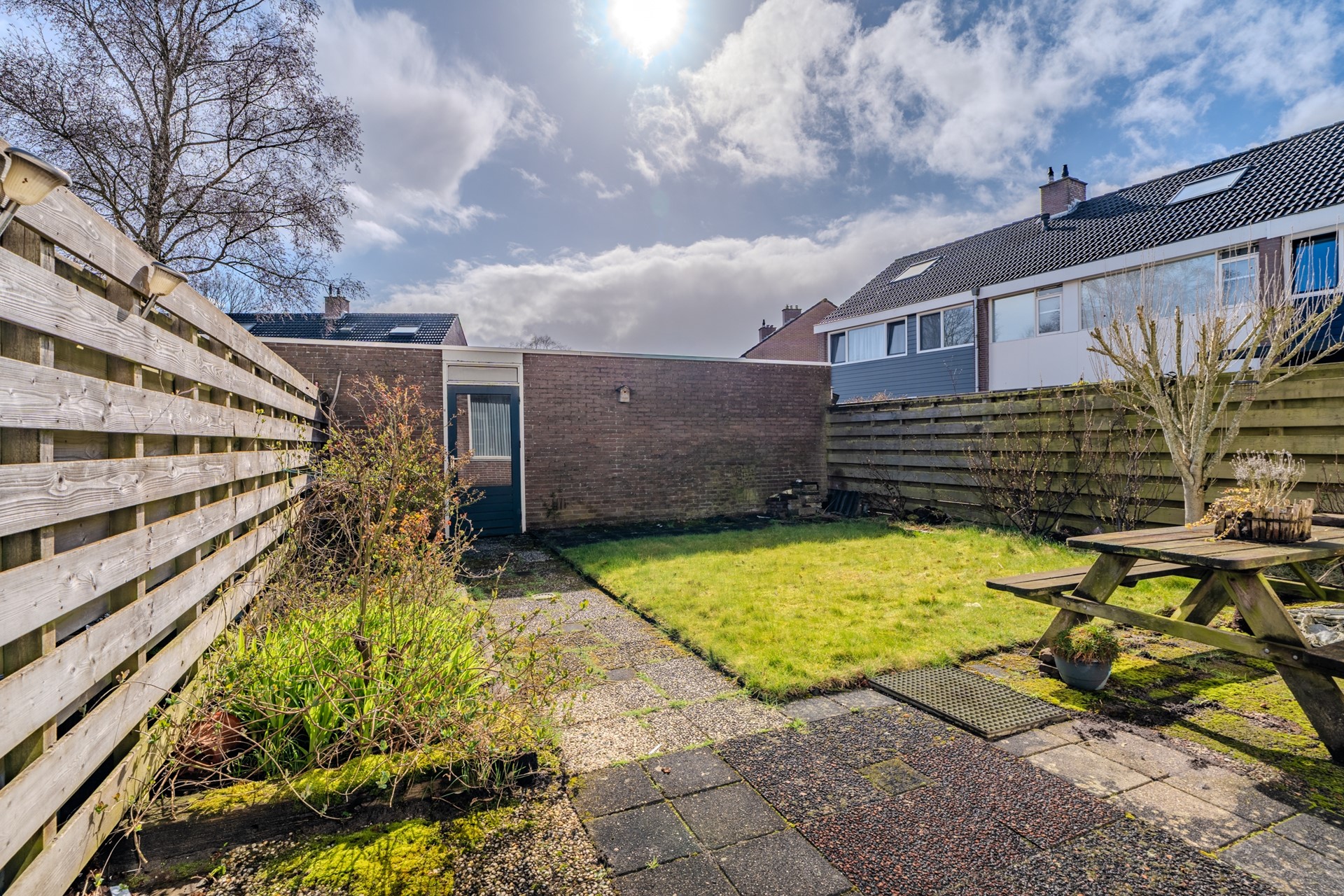 De voortuin is aangelegd als siertuin. De besloten achtertuin ligt op het zuidoosten en beschikt over twee terrassen, sierbeplanting en een gazon. Dankzij de eigen achterom is de tuin ook praktisch bereikbaar.